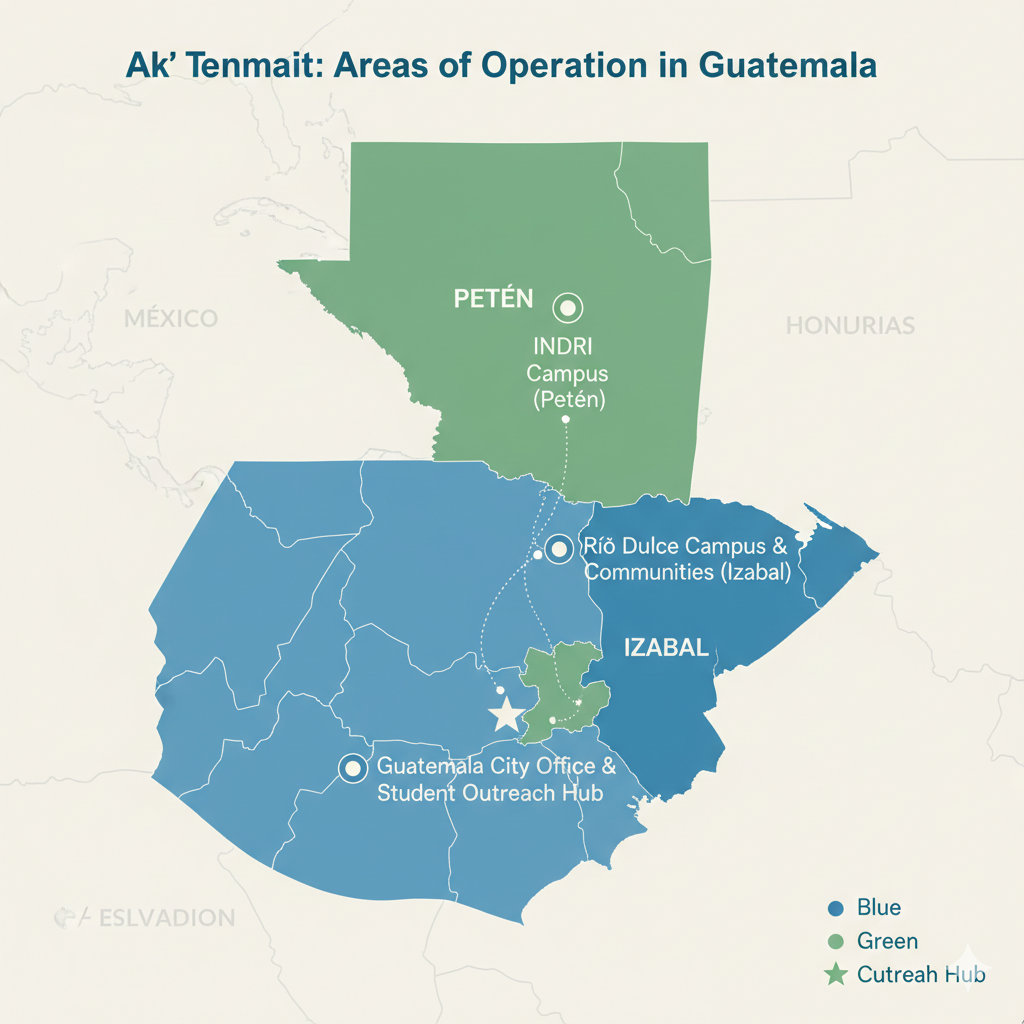 Ak’ Tenamit’s work is concentrated in eastern Guatemala, primarily in the Río Dulce area of the municipality of Livingston within the Izabal department. We operate two rural vocational boarding high schools and dormitories: the main campus near the Río Dulce and the INDRI campus located in the department of Petén. These two educational centers, along with an administrative office in Guatemala City, allow us to serve students from 11 departments (states), representing 10 indigenous and Afro-Caribbean groups. The funds and development programs—focused on education, healthcare, and community empowerment—primarily impact the remote, underserved indigenous Q’eqchi’ Maya communities across the Izabal and Petén regions.